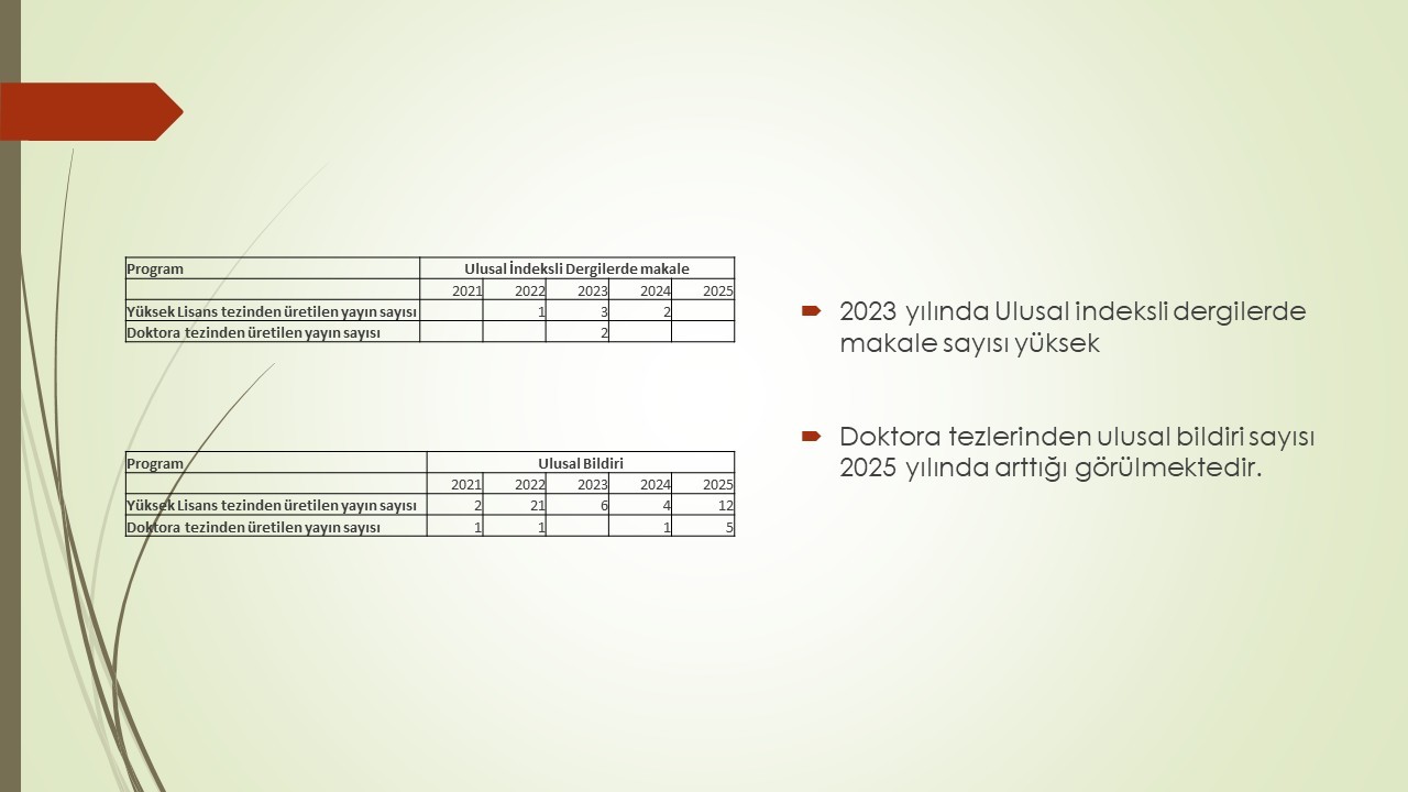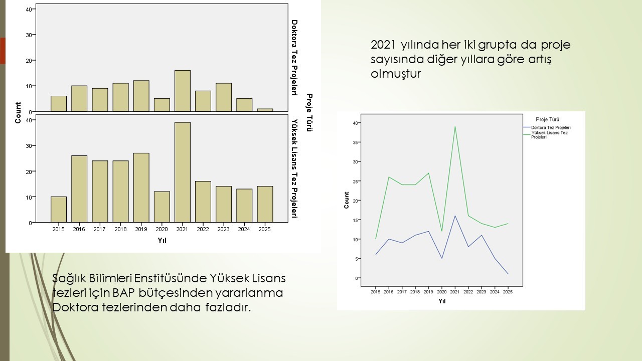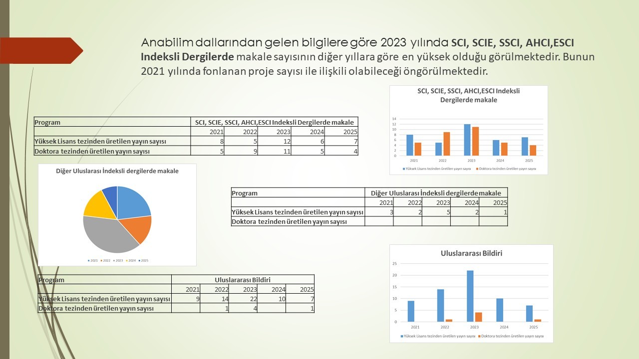Enstitümüz Yüksek Lisans ve Doktora Tezlerinden Üretilen yayın ve proje sayıları analiz edilerek sunulmuştur. Öğrencilerimize ve Danışmanlarımıza öz verili çalışmaları için teşekkür ediyor ve hem nitelik hem de nicelik olarak katlanarak devam etmesini diliyoruz.