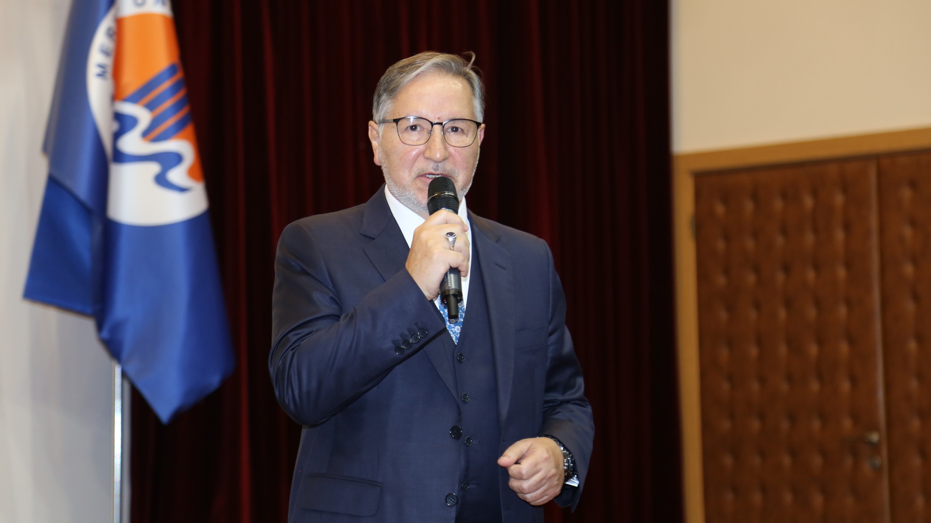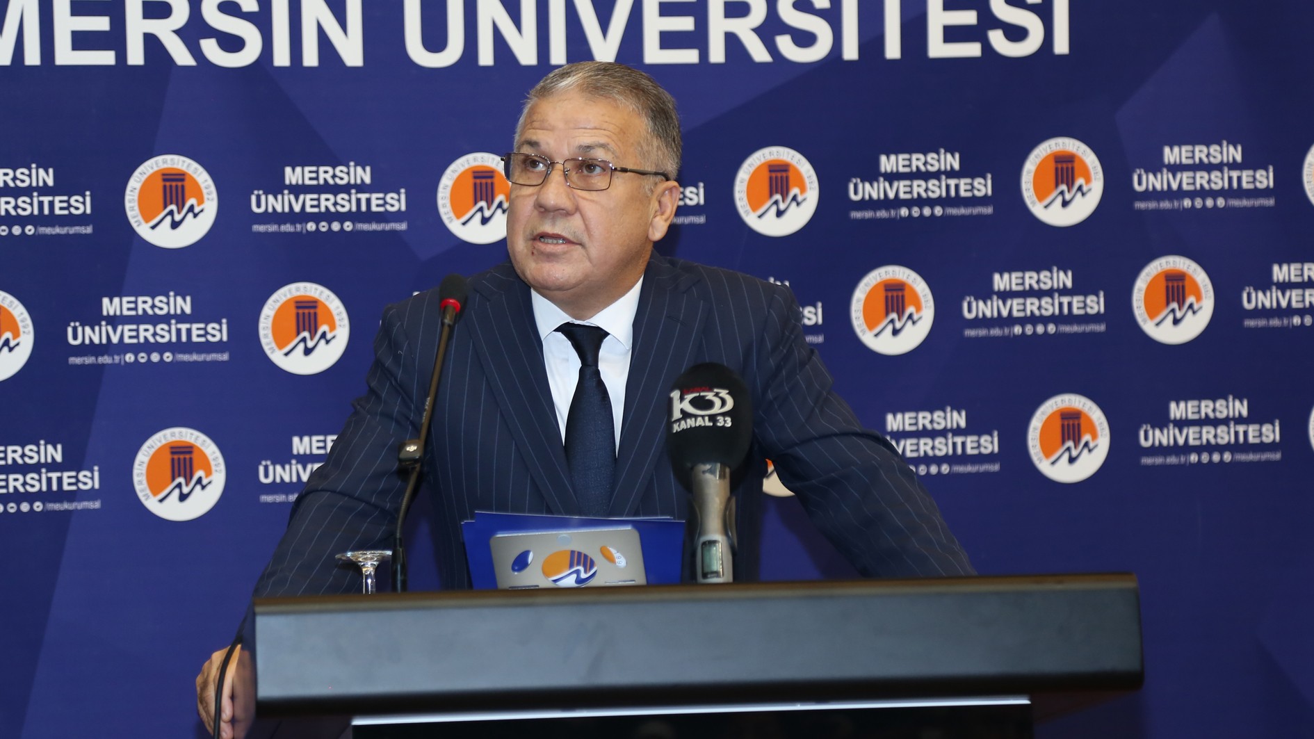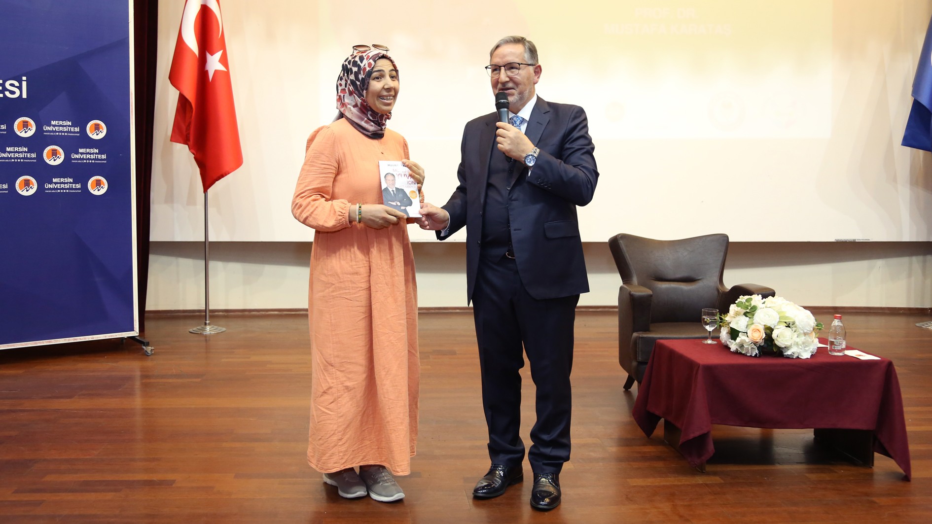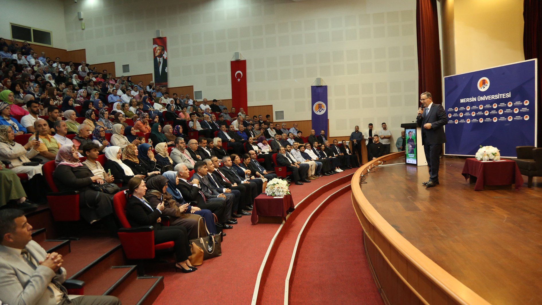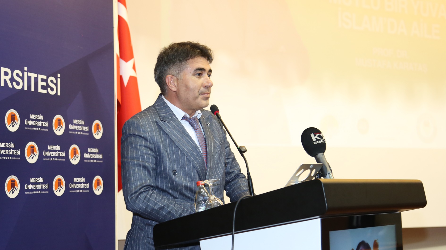 Mersin Üniversitesi olarak sadece bilimsel ve teknolojik gelişmelere öncülük etmeyi değil, aynı zamanda bizi biz yapan manevi değerleri ve toplumsal dinamikleri de gündemimizde tutmayı bir vazife bildiklerini ifade ederek konuşmasına başlayan Rektörümüz Prof. Dr. Erol Yaşar, “Bu bağlamda, 2025 Aile Yılı olarak ilan edilen bu anlamlı yılın ruhuna uygun biçimde düzenlediğimiz bu konferans, aile kurumunun kutsiyetini ve ehemmiyetini bir kez daha hatırlamak için önemli bir fırsattır. Çünkü biliyoruz ki huzurlu bireyler, güçlü toplumlar ve aydınlık bir gelecek ancak sağlam temeller üzerine kurulmuş mutlu aile yuvalarıyla mümkündür. Bugün bu önemli konuyu, engin bilgisi ve hikmetli yorumlarıyla bizlere aktaracak olan çok kıymetli ilim insanı Prof. Dr. Mustafa Karataş hocamızı aramızda görmekten büyük bir onur duyuyoruz. Kendisine, davetimizi kabul ederek bu anlamlı günde bizlerle birlikte olduğu için üniversitem ve şahsım adına en içten şükranlarımı sunuyorum.” şeklinde konuştu.